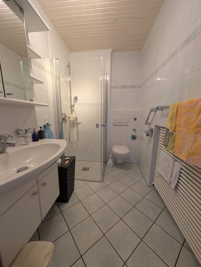 Die Wohnung verfügt über ca. 84 m² Wohnfläche, verteilt auf drei gut geschnittene Zimmer. Das innenliegende Duschbad ist hell gestaltet und mit einer modernen, ebenerdigen Dusche ausgestattet.