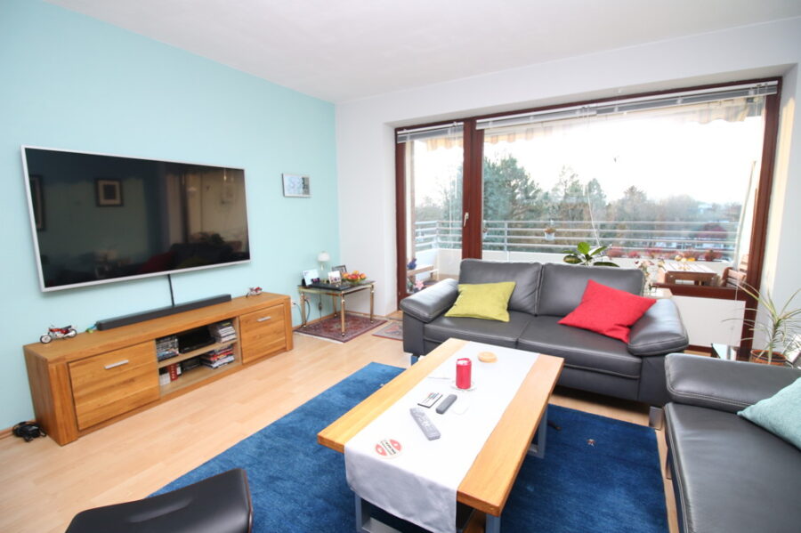 Im Zentrum steht das geräumige Wohnzimmer, das dank großer Fensterflächen lichtdurchflutet ist und eine besonders angenehme Wohnatmosphäre schafft. Von hier aus gelangen Sie direkt auf den außergewöhnlich großen Balkon, der sich über die gesamte Wohnungsbreite erstreckt und einen unverbaubaren Blick ins Grüne bietet. Ob beim morgendlichen Kaffee oder beim Ausklang eines Sommertages – hier lässt es sich wunderbar entspannen und neue Energie tanken.